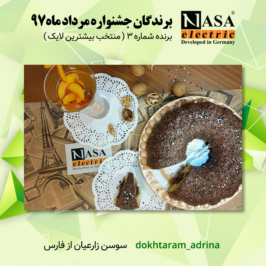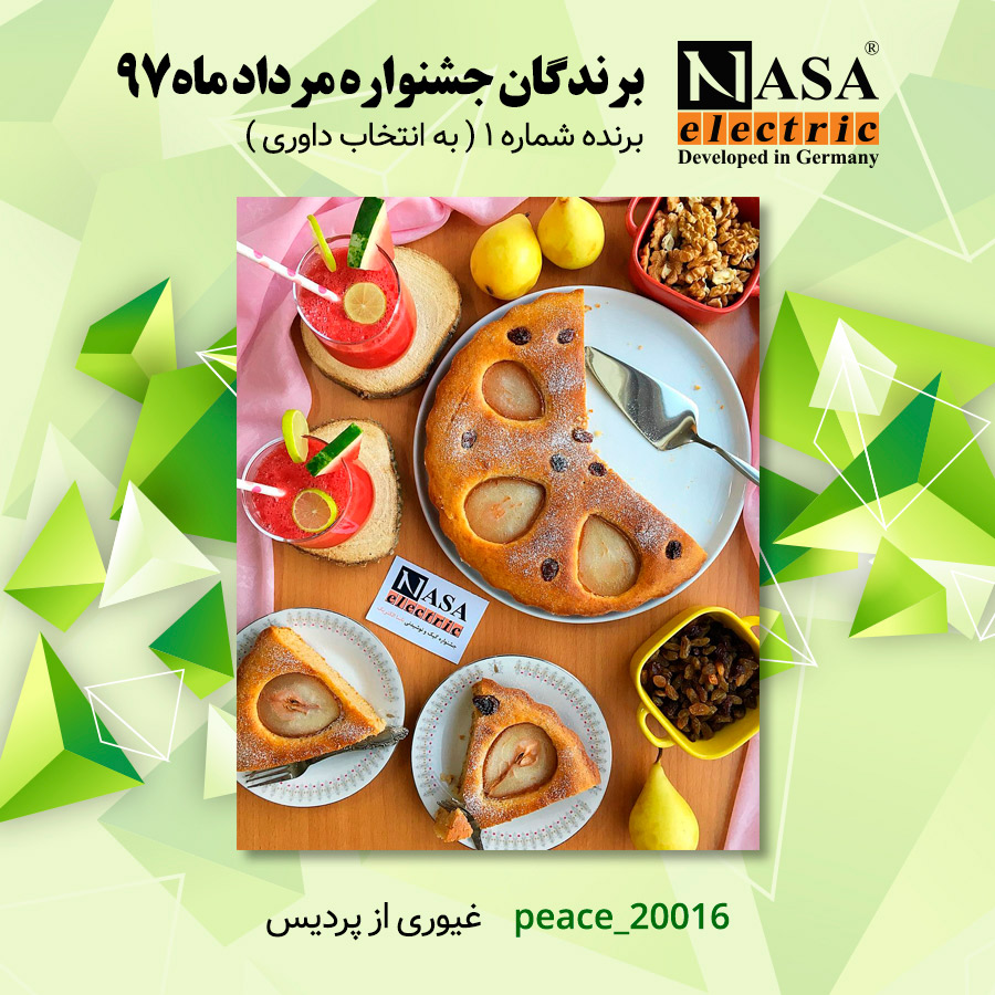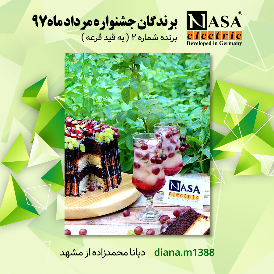 در این روزهای گرم تابستانی ناسا الکتریک با برگزاری جشنواره مرتبط با این حال و هوا نشاطی به فضای خانه های مردم شریف ایران داد. این جشنواره با عنوان کیک و نوشیدنی تابستانه بود که مورد استقبال همه اللخصوص بانوان عزیز قرار گرفت. روال مسابقه مشخص بود و کافی بود بانوان عزیز با درست کردن یک شربت خنک تابستانه به همراه یک کیک خوشمزه در این جشنواره شرکت کنند. این جشنواره در بستر اینستاگرام برگزار شد و بیش از 100 شرکت کننده از همه جای ایران در آن شرکت داشتند. شیوه انتخاب برندگان به سه روش متفاوت بود: 1. داوری 2.قرعه کشی 3. لایک و هدف ما از این سه روش ایجاد فرصت های برابر برای بانوان عزیز بود تا همه به برنده شدن امید داشته باشند. در نهایت این جشنواره در تاریخ 30 مرداد اعلام نتیجه شد و آثار برندگان در این جشنواره به شرح زیر است.