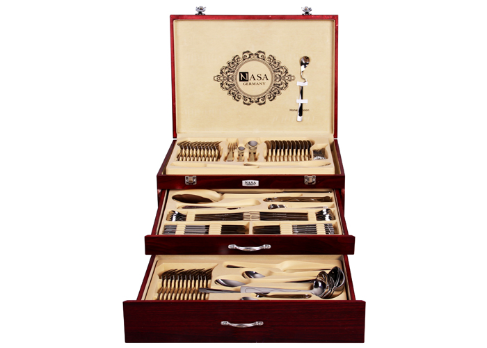 سرویس قاشق و چنگال 129 پارچه ناسا الکتریک مدل NS-1293 یک سرویس کامل با طراحی بی نظیر و از کیفیت ساخت بالایی برخوردار می باشد. جنس به کار رفته در این سرویس استیل مرغوب 18/10 می باشد که حاوی کروم برای حفظ پایداری در برابر لکه دار شدن و زنگ زدن می باشد همچنین نیکل به کار رفته در این سرویس ها باعث جلا و درخشندگی زیادی شده است. از ویژگی های سرویس قاشق و چنگال 129 پارچه ناسا الکتریک مدل NS-1293 اندازه و وزن استاندارد آن می باشد. برای نگه داری این سرویس یک جعبه بسیار زیبای چوبی سه طبقه ارائه می گردد.
