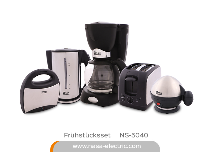 Das komplette und funktionale Set beinhaltet einen Wasserkocher, kochenden Kaffee, einen Sandwichmaker, ein Ei und einen Brottoaster