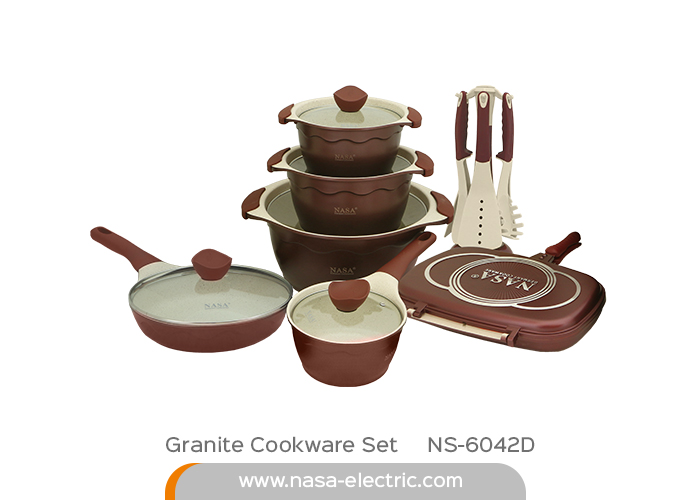 Cookware Set Model NS-6042D Gratito coated cookware set Include inductor in pot and pan bottoms Glass lid, silicon handle 3 pcs pot in 20-24-32 cm size, 1 pc sauce pan 18 cm size 26 cm fry pan, 36 cm double fry pan 3 colors: pink/dark red/crème
