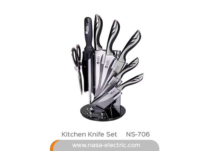 Kitchen Knife Set Model NS-706 Made of high quality stainless steel Ergonomic handle coated with silicon Steel and acrylic base This collection consists of hatchet, chef knife, functional knife, stripper knife Scissors, knife sharpening