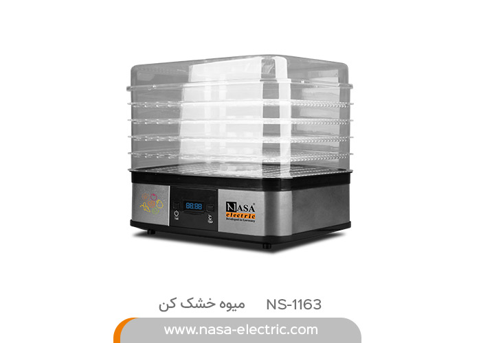 میوه خشک کن ناسا الکتریک NS-1163 دستگاهی کاربردی برای خشک کردن میوه و سبزیجات است ، که مخصوصاً در فصل تابستان کاربرد بسیار زیادی دارد. این میوه خشک کن دارای شکل خاص مستطیلی شکل یوده و از 5 طبقه مجزا تشکیل شده است. د رواقع این میوه خشک کن 5 طبقه قابلیت حشک کردن حجم زیادی از میوه را در هر بار استفاده دارد. بدنه میوه خشک کن NS-1163 از استیل ضد زنگ و پلاستیک با کیفیت ABS ساخته شده و طبقات یا سینیها از پلاستیک شفاف میباشند، که در برابر حرارت و خط و خراش برداشتن مقاومت بسیار بالایی دارد. بر روی بدنه این دستگاه یک نمایشگر LED قرار گرفته است، که مدت زمان و درجه حرارت انتخابی را با رنگ آبی نمایش خواهد داد. در این میوه خشک کن قابلیت تنظیم درجه حرارت از 40 تا 70 درجه سانتیگراد تعبیه شده است و قابلیت تنظم زمان از 1 تا 36 ساعت میباشد.