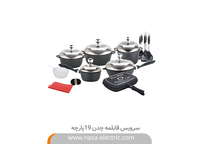 سری 19 پارچه ناسا مدل NS – 6019 با مجموعه کاملی از تابه و قابلمه عرضه شده است . این سری دارای 3 قابلمه در اندازه های مختلف به همراه درپوش ، 1 عدد قابلمه تک دسته با درپوش ، 1 عدد تابه عمیق دسته دار با درپوش ،1 عدد تابه دو طرفه بزرگ و کاملاً نچسب و ست کفگیر و ملاقه می باشد همچنین یک پیش بند آشپزی ، یک عدد دستکش فر و یک جفت دستگیره ضد حرارت پوته و یک صافی رایگان به همراه سرویس تابه موجود می باشد.