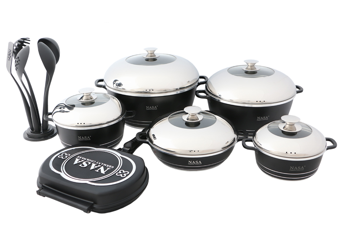 سرویس قابلمه ناسا الکتریک مدل NS-6024 شامل ظروفی مقاوم و با کیفیت بوده و می توانید به دوام و سلامت آنها مطمئن باشید، این مجموعه عالی و بی نظیر از جنس آلومینیوم 4 لایه ساخته شده و به این شکل حرارت به صورت یکنواخت در آنها پخش می گردد، در نتیجه تمامی قسمتهای غذای شما حرارت گرفته و پخته می شود، بدون آنکه قسمتی از غذای شما نپخته و قسمتی دیگر بسوزد.