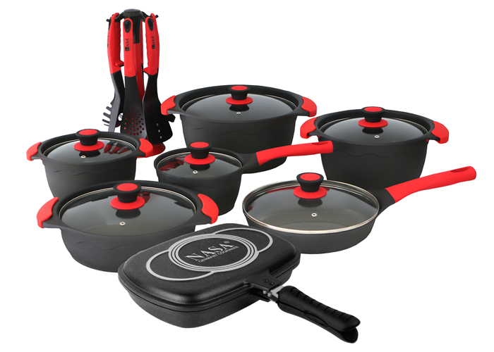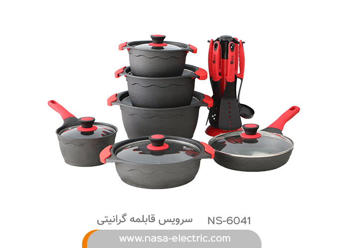 سرویس قابلمه ناسا الکتریک NS-6041 دارای 3 عدد قابلمه گود و یک ماهیتابه رژیمی و ماهیتابه 26 سانتیمتری و ماهیتابه گود و شیر جوش و وسایل آشپزی میباشد. درب این ظروف پخت و پز از جنس شیشه پیرکس بوده که با دریچه تخلیه بخار مانع از سر ریز شدن محتویات داخل ظروف میگردد. همچنین دستهای که برای این ظروف در نظر گرفته شده از جنس پلاستیک با روکش سیلیکونی بوده که در مقابل حرارت مقاومت بالایی دارد.