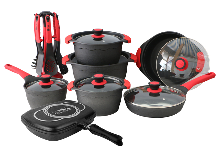 سرویس قابلمه گرانیتی ناسا الکتریک NS-6042 یک سرویس 13 پارچه است، که از کیفیت بسیار بالایی برای پخت و پز بهره میبرد. این مجموعه از جنس آلومینیوم 5 لایه بوده که موجب انتشار سریع و یکنواخت حرارت در تمامی سطح ظرف میگردد و با داشتن پوشش گرانیتی مرغوب و با دوام در برابر ساییدگی و خش، موجب سهولت در استفاده و تمیز کردن آن خواهد بود. گرانیت پوششی ترکیبی از تفلون و سرامیک است که مزایای هر دو را هم دارد. این پوشش گرانیتی بر روی بدنه آلومنیومی سرویس قابلمه قرار میگیرد، که اتفاقاً دانههایی بصورت پراکنده در این پوشش دیده میشوند که همان دانههای سرامیکی سر سخت میباشند.