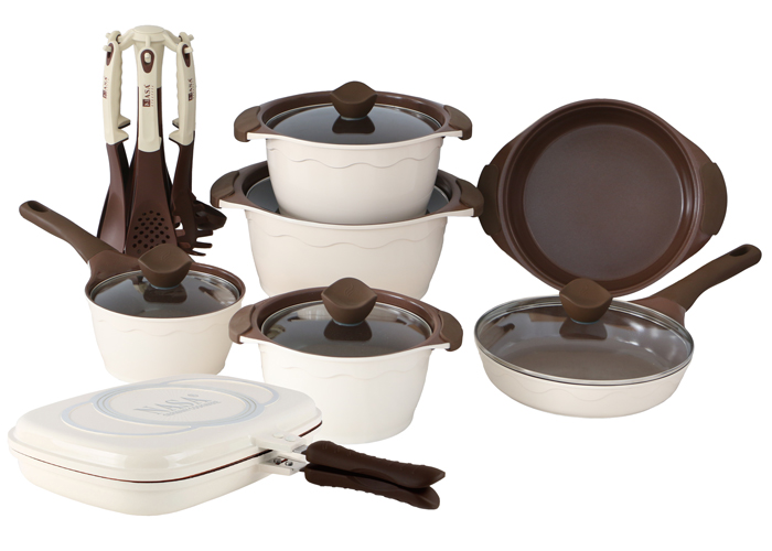 این سرویس شامل سه عدد قابلمه گود در سایزهای 20-24-28 سانتیمتر، یک عدد شیر جوش سایز 18 سانتیمتر، یک عدد ماهیتابه دربدار سایز 26 سانتیمتر و یک عدد ماهیتابه رژیمی سایز 36 سانتیمتر میباشد. تمامی این ظروف پخت و پز کار شما را در آشپزی راحت خواهند کرد، تا متناسب با نوع غذا سرخ کردنی یا خورشت و همچننی متناسب با اندازه تفراد ظرف مناسب را انتخاب و از آن استفاده نمایید.انواع سرخ کردنیها را میتوانید با تابه درب دار سرخ کنید و همچنین برای درست کردن غذایی سالم با کمترین میزان روغن میتوانید از ماهیتابه رژیمی استفاده کنید، که با یک قاشق روغن مواد غذایی آبکی را سرخ خواهد کرد. همچنین قابلمهها که اندازههای مختلفی دارند نیز برای درست کردن انواع غذا نظیر سوپ و خورشت و پلو به کار میروند.