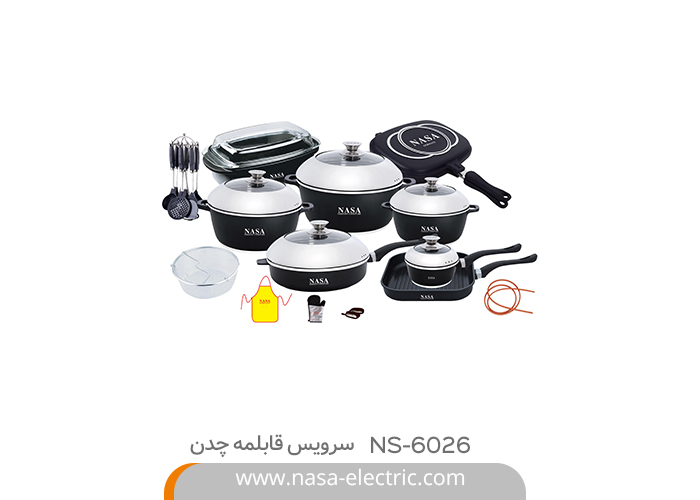 سرویس قابلمه چدن NS-6026 این سرویس قابلمه، با ساتفاده از مواد اولیه با کیفیت بالا و جهت بهینه سازی مصرف انرژی تولید شده است این سرویس کلیه ظروف به شکل دایره ای(گرد) تولید شده اند.تعداد ظروف این گروه 29 تکه می باشد.