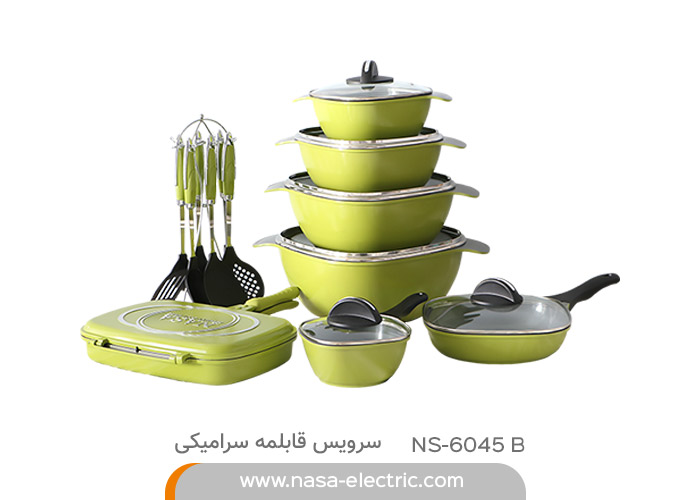 سرویس قابلمه NS-6045B یک سرویس کامل برای پخت و پز است، که از 4 قابلمه گود در اندازههای مختلف از کوچک گرفته تا بزرگ و ماهیتابه رژیمی و تابه درب دار و شیرجوش و ... را شامل میشود. رنگ بدنه این ظروف سبز است و به خوبی میتواند با دیگر رنگها هماهنگ شود. سرویس قابلمه 13 پارچه NS-6045B شامل 4 عدد قابلمه گود با سایزهای 20 سانتیمتر، 24 سانتیمتر، 28 سانتیمتر و 32 سانتیمتر و یک عدد شیرجوش 16 سانتیمتر و یک عدد ماهیتابه دربدار در سایز 24 سانتیمتر میباشد. ماهیتابه رژیمی 36 سانتیمتری این سرویس قابلمه مرغوب از آن دست مواردی است که طرفداران زیادی دارد. چرا که این ماهیتابه امکان تهیه انواع غذای سرخ شده را با روغن بسیار کم و یا بدون روغن را دارد.