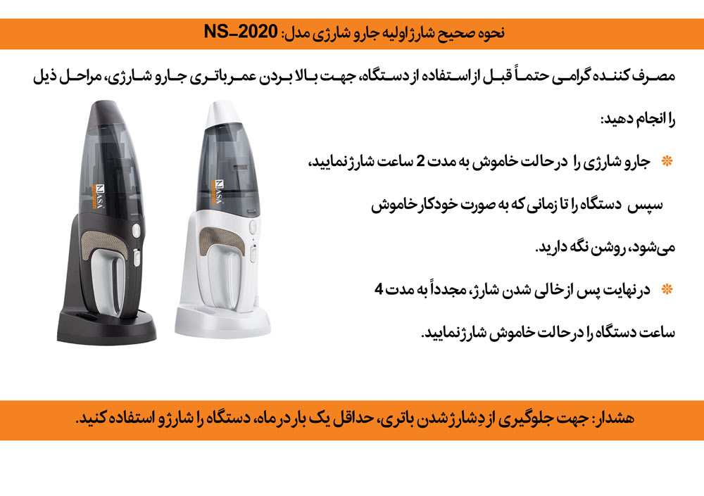 جاروشارژی به دلیل عدم وابستگی به پریز برق و کارایی و استفاده راحت و دسترسی سریع به فضاها و مکانهایی با دسترسی سخت و محدود نسبت به جاروبرقی برتری دارد. یکی از وسایل کاربردی که برای نظافت منزل استفاده میشود، جاروشارژی است. جاروشارژی ناسا الکتریک مدل NS-2020 تنها قابلیت استفاده به صورت دستی را دارد و دارای ابعاد و وزن مناسبی میباشد. از برجستهترین ویژگیهای این جاروشارژی قابلیت جذب مایعات است، در واقع این قابلیت کاربری جاروشارژی را به جارو شارژی آب و خاک تغییر داده است. مخزن این جارو شفاف بوده و داخل آن کاملاً مشخص است. شفاف بودن مخزن شما را از وضعیت مخزن باخبر میسازد، تا در صورت نیاز برای جلوگیری از افت مکش نسبت به تخلیهی به موقع آن اقدام کنید.