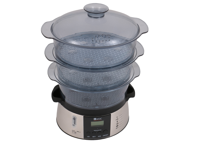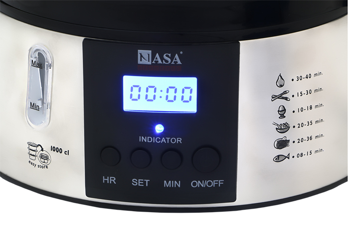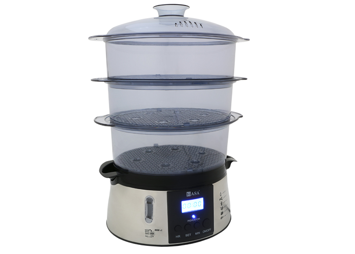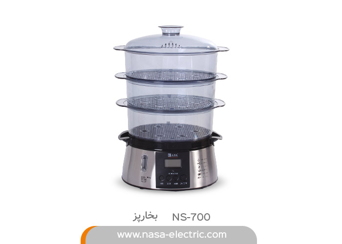بخارپز ناسا الکتریک NS-700 محصولی بسیار کاربردی و با کیفیت است، که برای بخارپز کردن مواد غذایی مختلف مورد استفاده قرار میگیرد. بدنه این محصول از ترکیب استیل وپلاستیک ساخته شده است و از ظرفیت مناسبی برخوردار میباشد. بخارپز NS-700 دارای سه طبقه مجزا برای بخارپز کردن مواد غذایی است، که این 3 طبقه برروی هم قرار گرفتهاند. این طراحی ( سه طبقه بودن) ترفندی است برای افزایش دادن ظرفیت بخارپز، تا در هر بار استفاده بتواند حجم زیادی از مواد غذایی را بخارپز نماید. برروی سه سینی بخارپز یک درپوش شفاف قرار گرفته شده، که دارای دریچههای متعدد برای خروج بخار اضافی است.